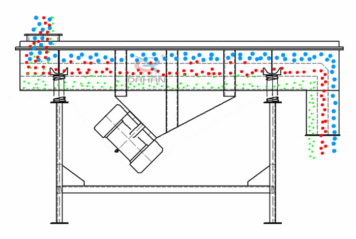 直線篩使用振動(dòng)電機(jī)作為振動(dòng)源,采用雙振動(dòng)電機(jī)驅(qū)動(dòng),當(dāng)兩臺(tái)振動(dòng)電機(jī)做同步、反缶旋轉(zhuǎn)時(shí),振動(dòng)電機(jī)偏心塊所產(chǎn)生的激振力在平行于振動(dòng)電機(jī)軸線的方向相互抵消,在垂直于振動(dòng)電機(jī)軸線的方向重疊為一合力,因此振動(dòng)篩機(jī)的運(yùn)行軌跡為一直線。兩電機(jī)軸相對(duì)篩面有一傾角,在激振力和物料自重力的合力下,物料在篩面上被拋起跳躍式向前做直線運(yùn)動(dòng),通過各不同層次篩網(wǎng)篩分多種規(guī)格的篩上物、篩下物,又從不同的出料口排出,流入料倉或盛料筒,從而達(dá)到對(duì)物料進(jìn)行篩分的目的。