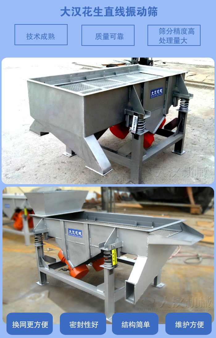 2、花生直線篩篩機(jī)設(shè)計(jì)精巧合力,結(jié)構(gòu)簡單,易安裝,耗能少、噪音低;