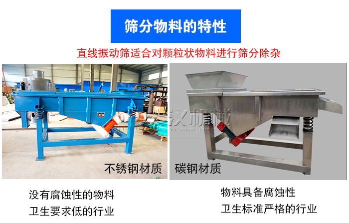 1)不同用戶選用的篩分物料不同,所以在選擇直線振動篩時需要參考物料特性。如果您篩分的物料具備腐蝕性,此時不能選擇普通碳鋼材質(zhì)的直線振動篩,需要采用不銹鋼直線振動篩,而且針對有嚴格衛(wèi)生標準的行業(yè),如:食品,醫(yī)藥等行業(yè),也需要選擇不銹鋼材質(zhì)的直線振動篩。