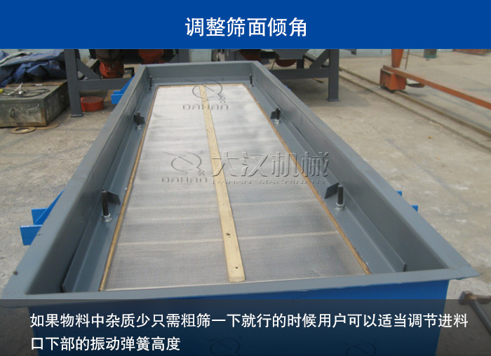 直線振動篩在設(shè)計時是有個傾斜角度的,通常情況下傾角為45°,但在實際使用過程中如果物料中雜質(zhì)少只需粗篩下就行的時候用戶可以適當(dāng)調(diào)節(jié)進料口下部的振動彈簧高度,進料口高度升高可以加快物料在篩面的運動從而實現(xiàn)提高產(chǎn)量的效果。