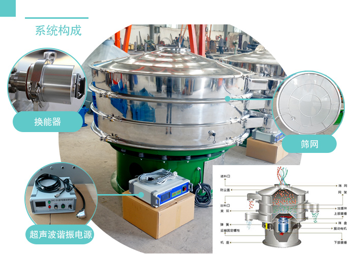 超聲波篩分系統(tǒng)由超聲波諧振電源、振蕩器、外網(wǎng)環(huán)和共振環(huán)組成。超聲波諧振電源產(chǎn)生的高頻電振蕩由振蕩器轉(zhuǎn)換成高頻正弦形式的縱向振蕩波,這些振蕩波通過換能器底座傳到共振環(huán)上使共振環(huán)產(chǎn)生共振,然后由共振環(huán)將振動均勻傳輸至篩面。篩網(wǎng)上的物料在做低頻三次元振動的同時,疊加上超聲波振動,既可防止網(wǎng)孔堵塞,又可提高篩分產(chǎn)量和質(zhì)量。