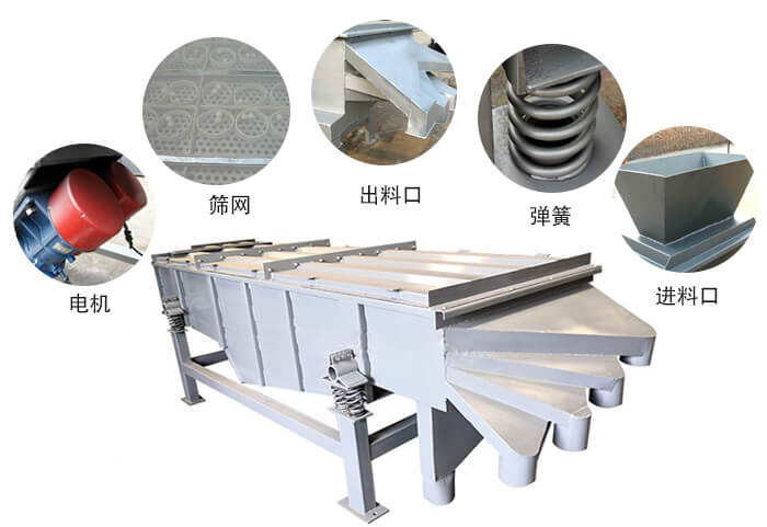 1030四層直線振動篩主要由篩箱、篩框、篩網(wǎng)、振動電機、電機臺座、減振彈簧、支架等組成。