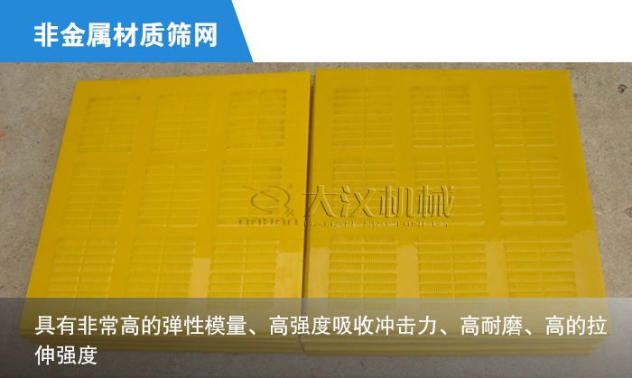 ④非金屬材質(zhì)的振動(dòng)篩篩網(wǎng)中,聚氨酯為常見(jiàn),因?yàn)榫郯滨ケ旧砭哂蟹浅8叩膹椥阅A?、高?qiáng)度吸收沖擊力、高耐磨、高的拉伸強(qiáng)度,因此其承載力較高,是橡膠篩板的 2.5 倍以上,使用壽命與普通金屬篩板相比提高8-10倍,是不銹鋼篩面的3倍,是天然橡膠的3.9倍,是當(dāng)前耐磨性能較好的振動(dòng)篩篩網(wǎng)材料。